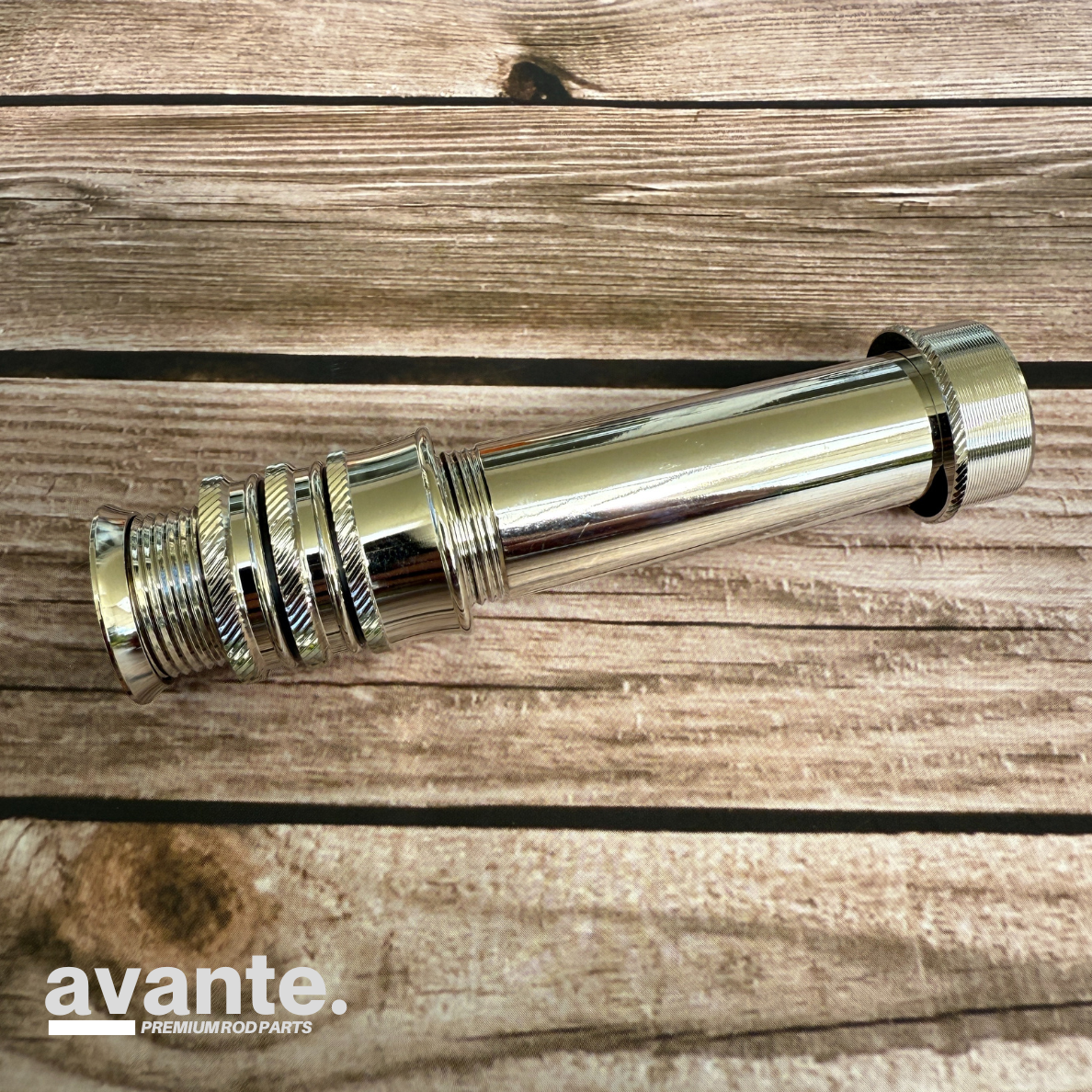 Sehr edler Uplock Rollenhalter für Ruten der Klasse 6-8 aus der Avante Heritage Series mit einem polierten Nickel Silber Finish und Anschlussring.