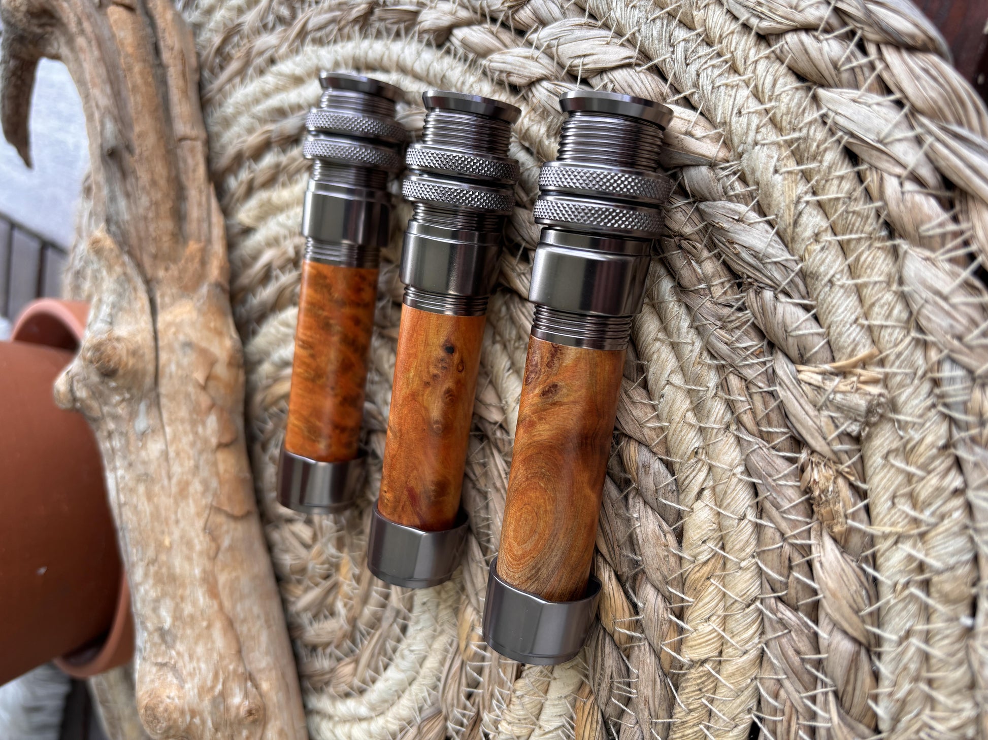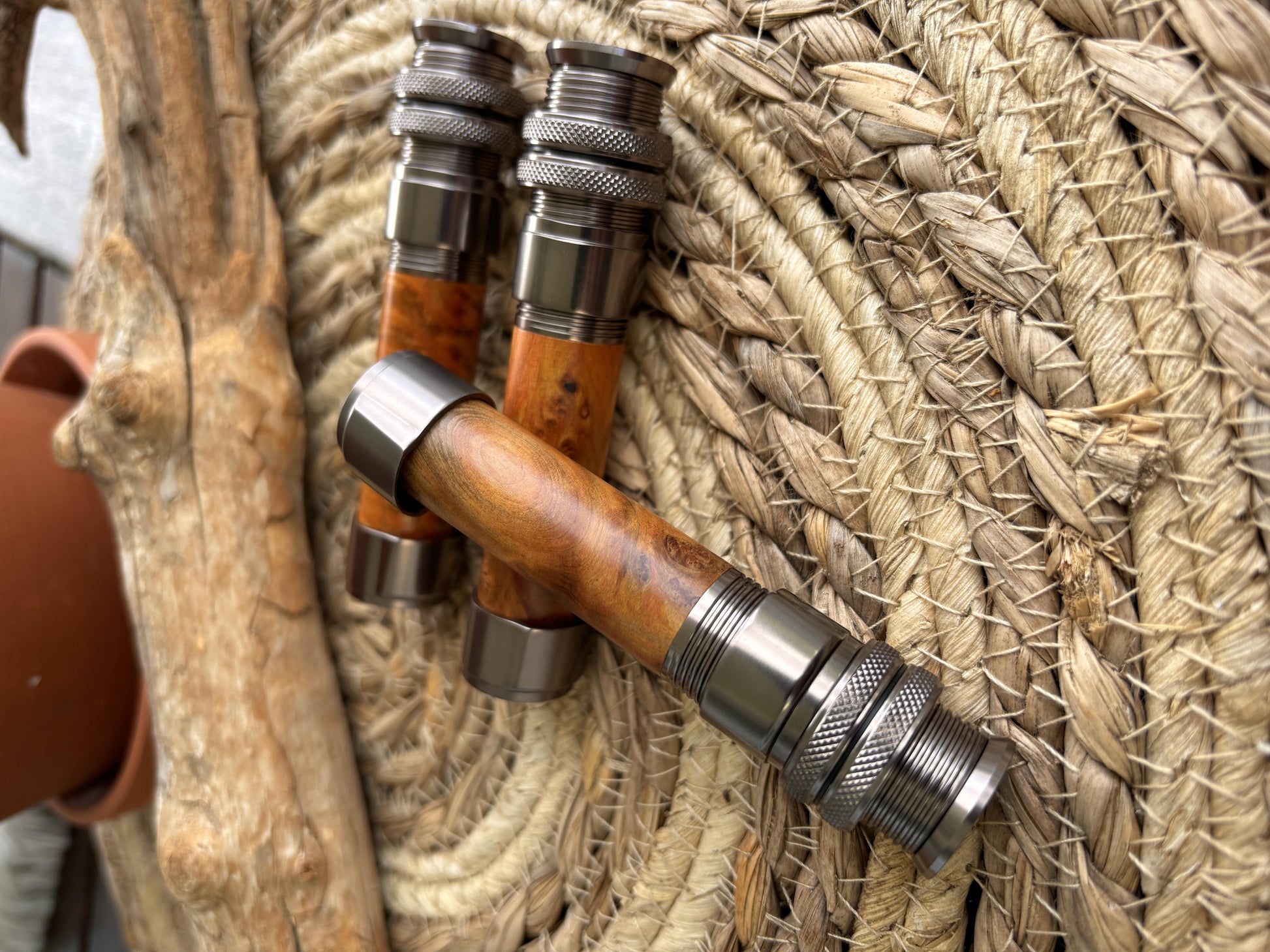 A very elegant downlock reel seat for rods in class 3-5 with a precious wood spacer and connecting ring in gunsmoke. The Snakebrand black nickel guides are a perfect match.