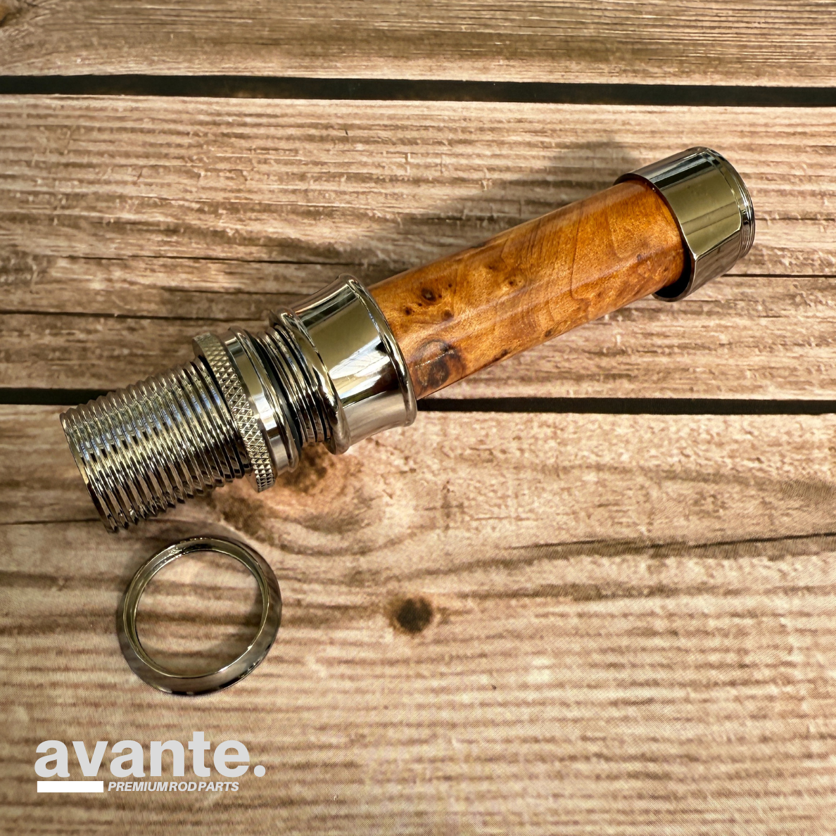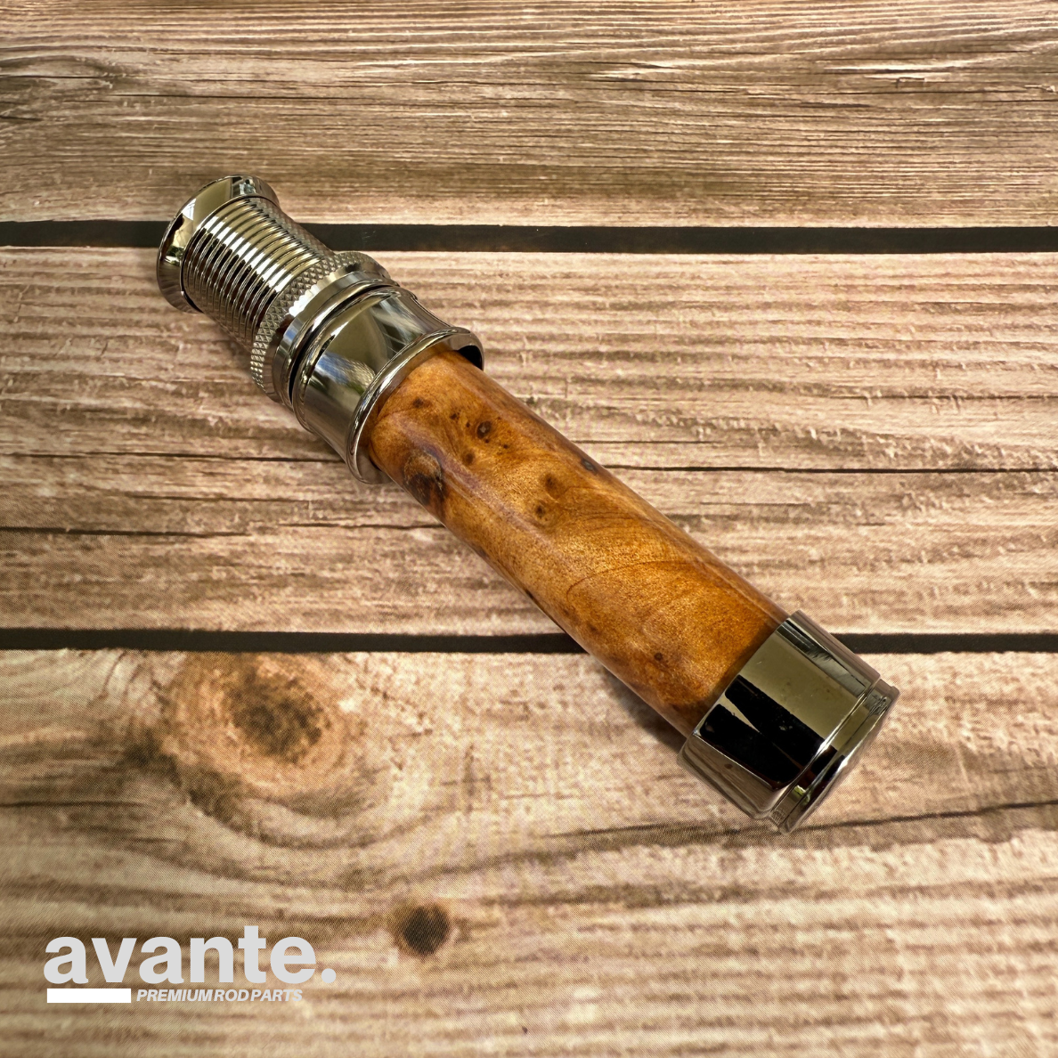 Very elegant uplock reel seat for rods of class 3-5 with precious wood spacer and end cap in chrome.