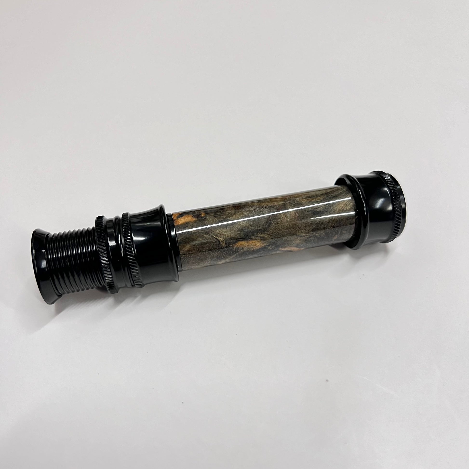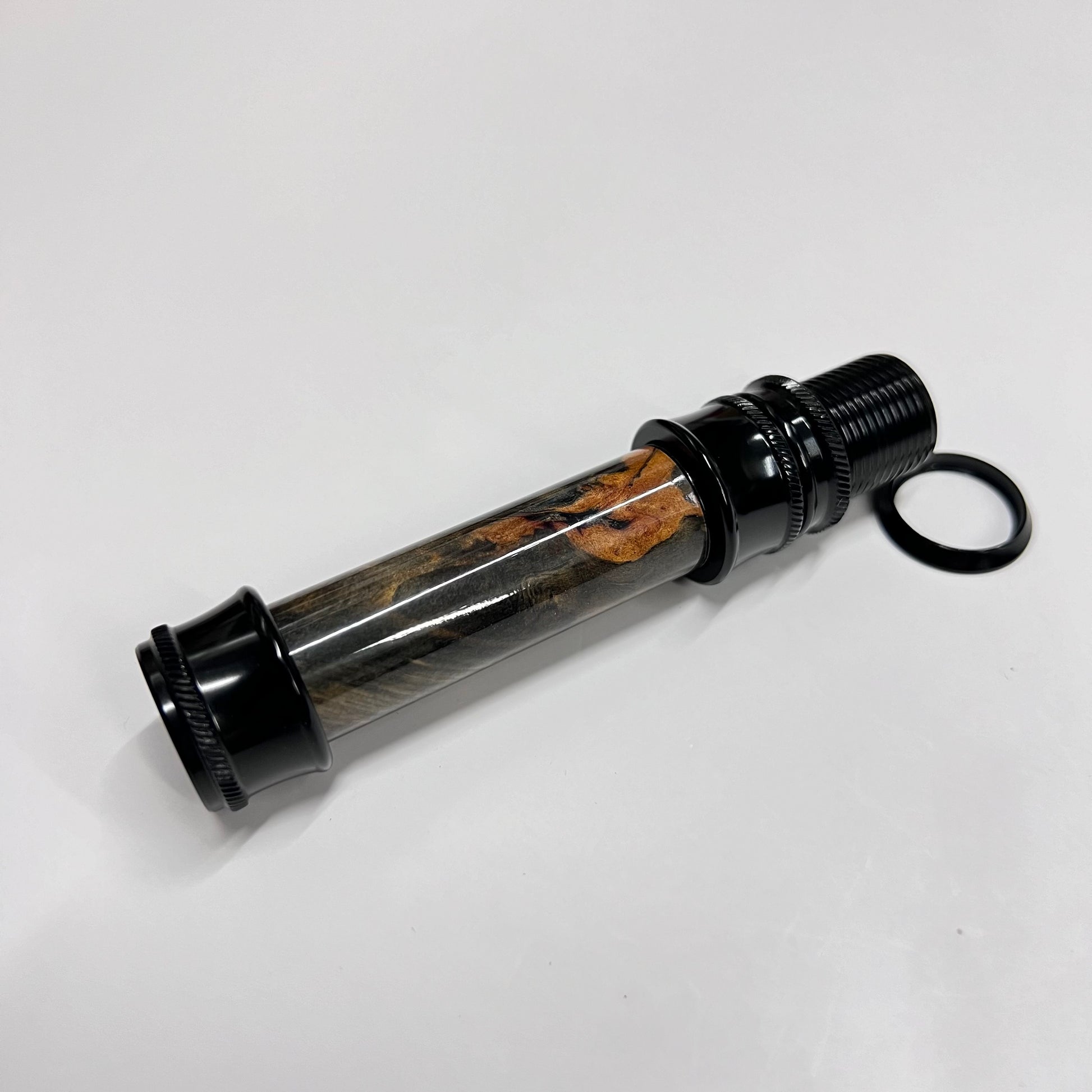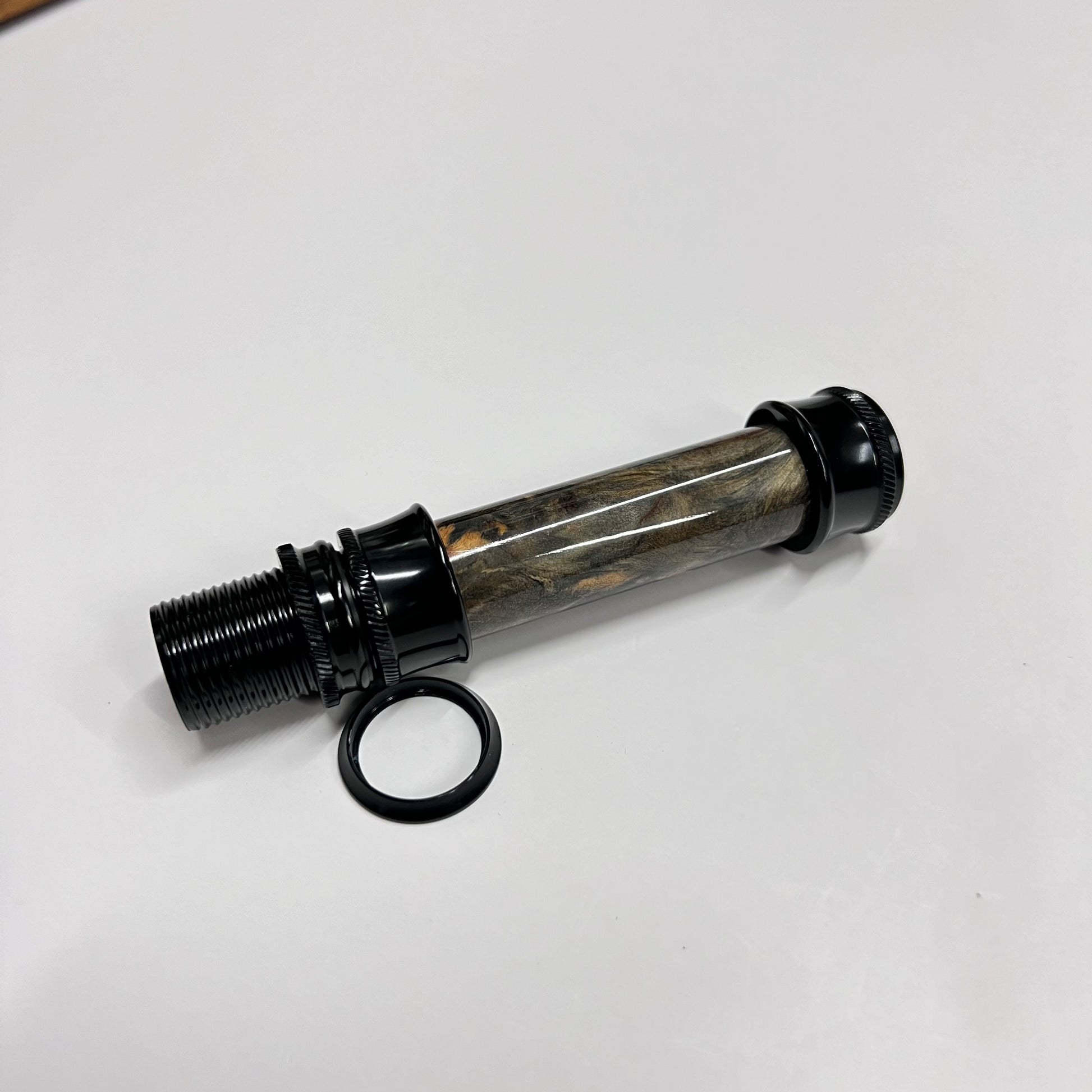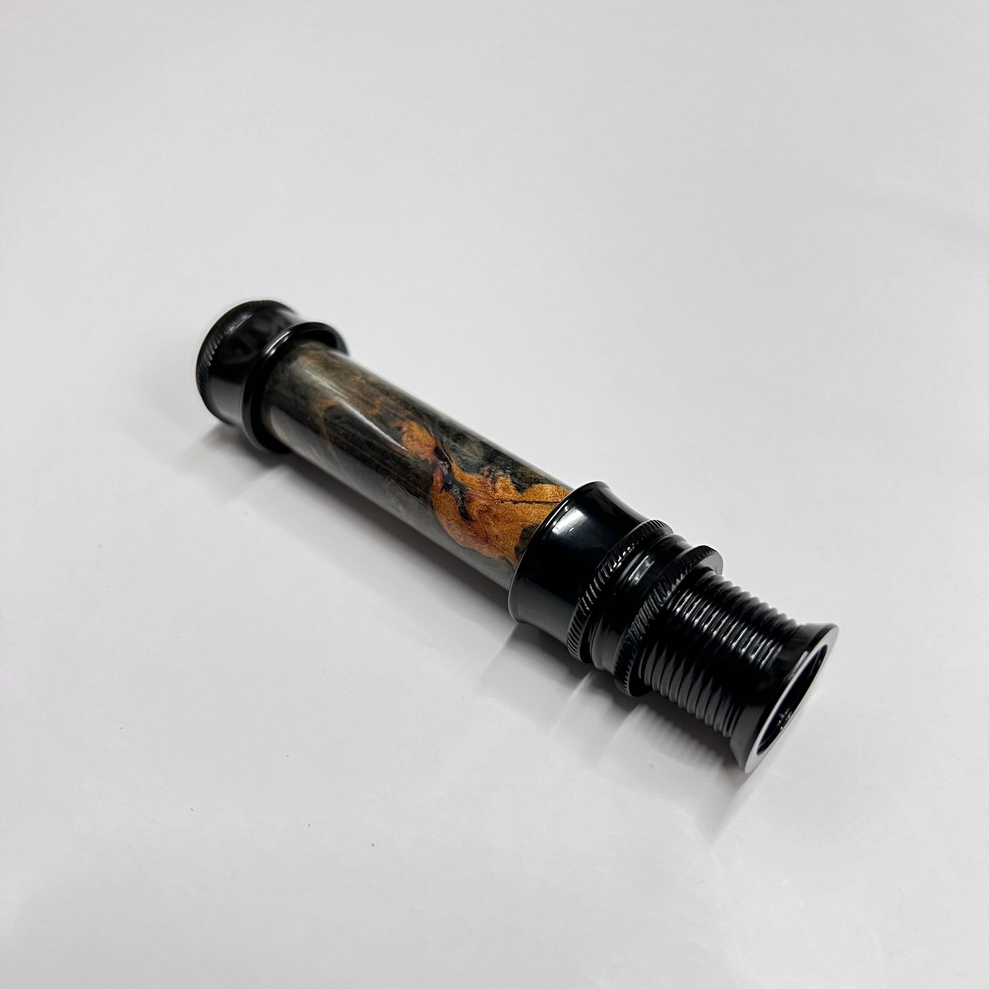 Beautiful Avante Studio Parts reel seat made of aluminum in downlock variation including a custom insert made of dyed and polished burl wood.