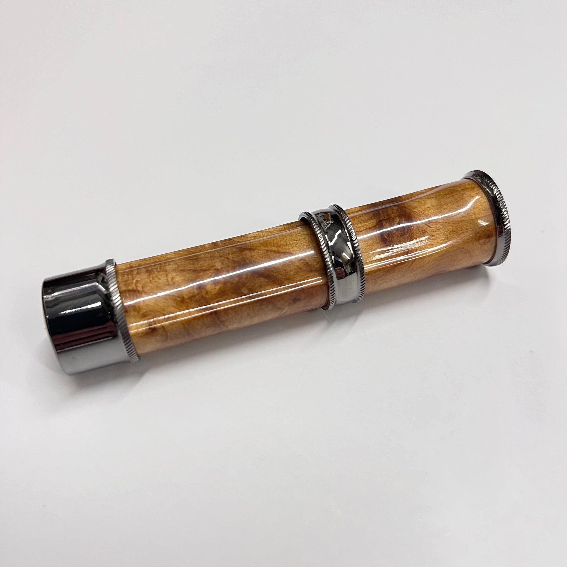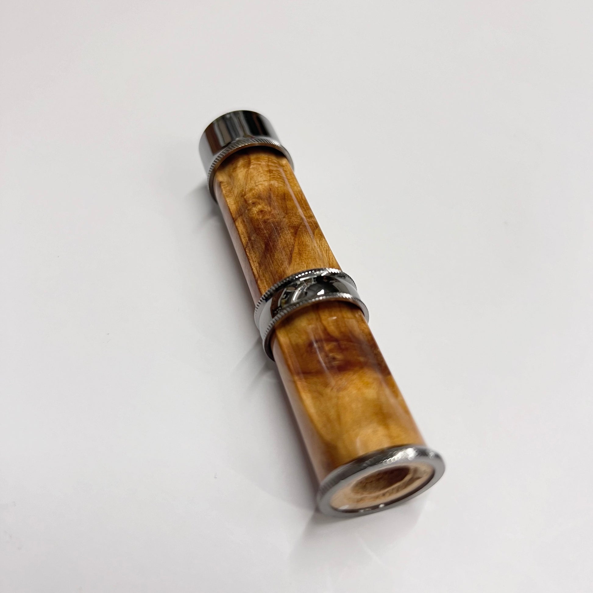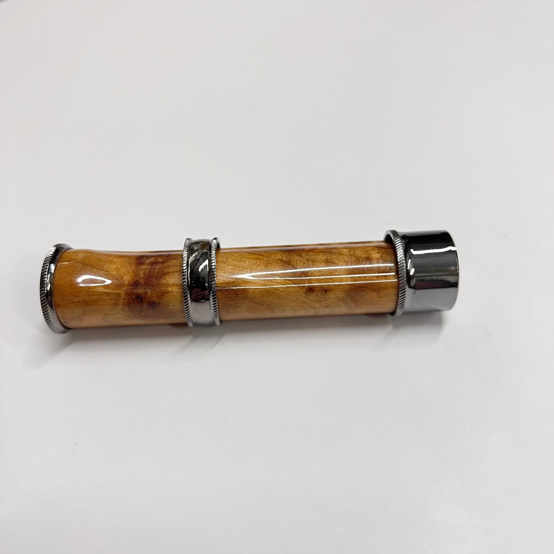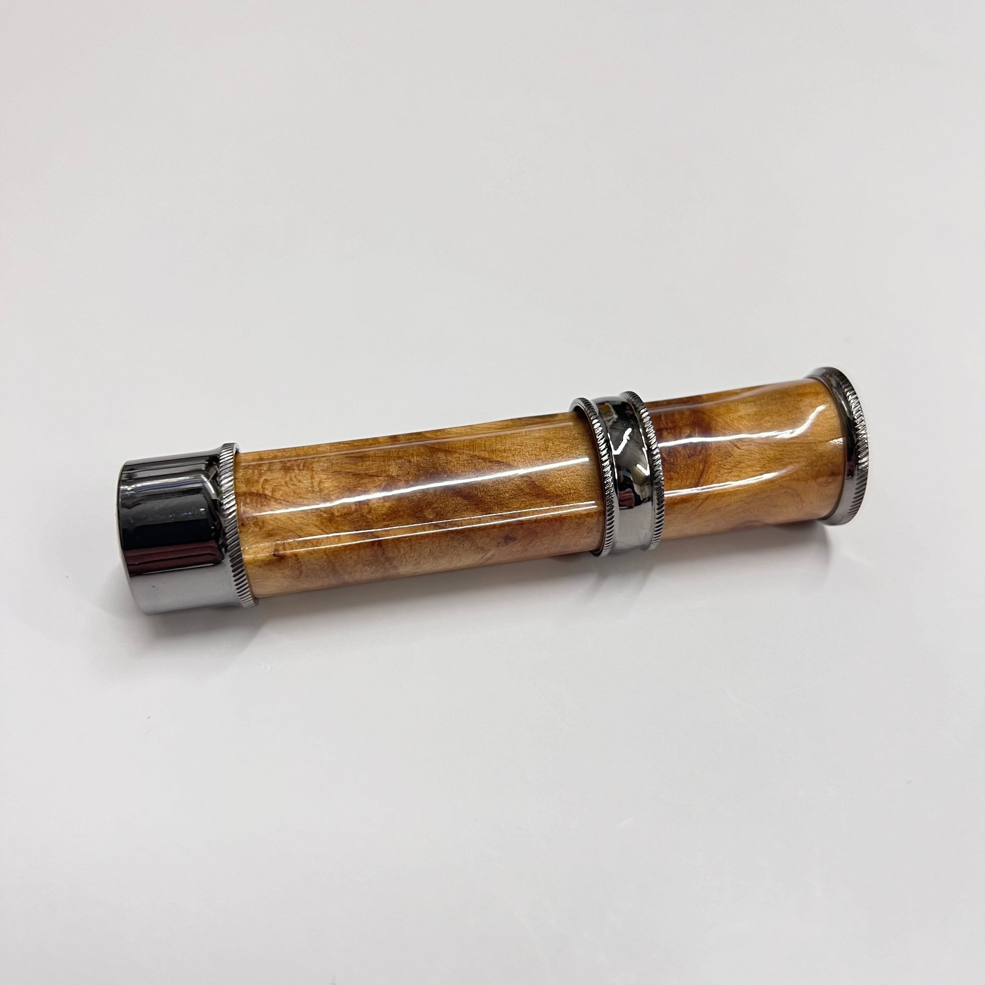 Magnifique porte-moulinet Avante Rodparts en maillechort dans la variante downlock comprenant un insert personnalisé en bois de ronce poli.